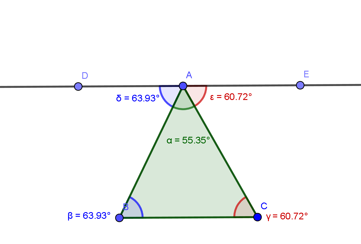 Because of this crossing, each interior angle of the triangle is matched by an alternate interior angle on the straight line. By the given geometric rule, these corresponding angles are equal.